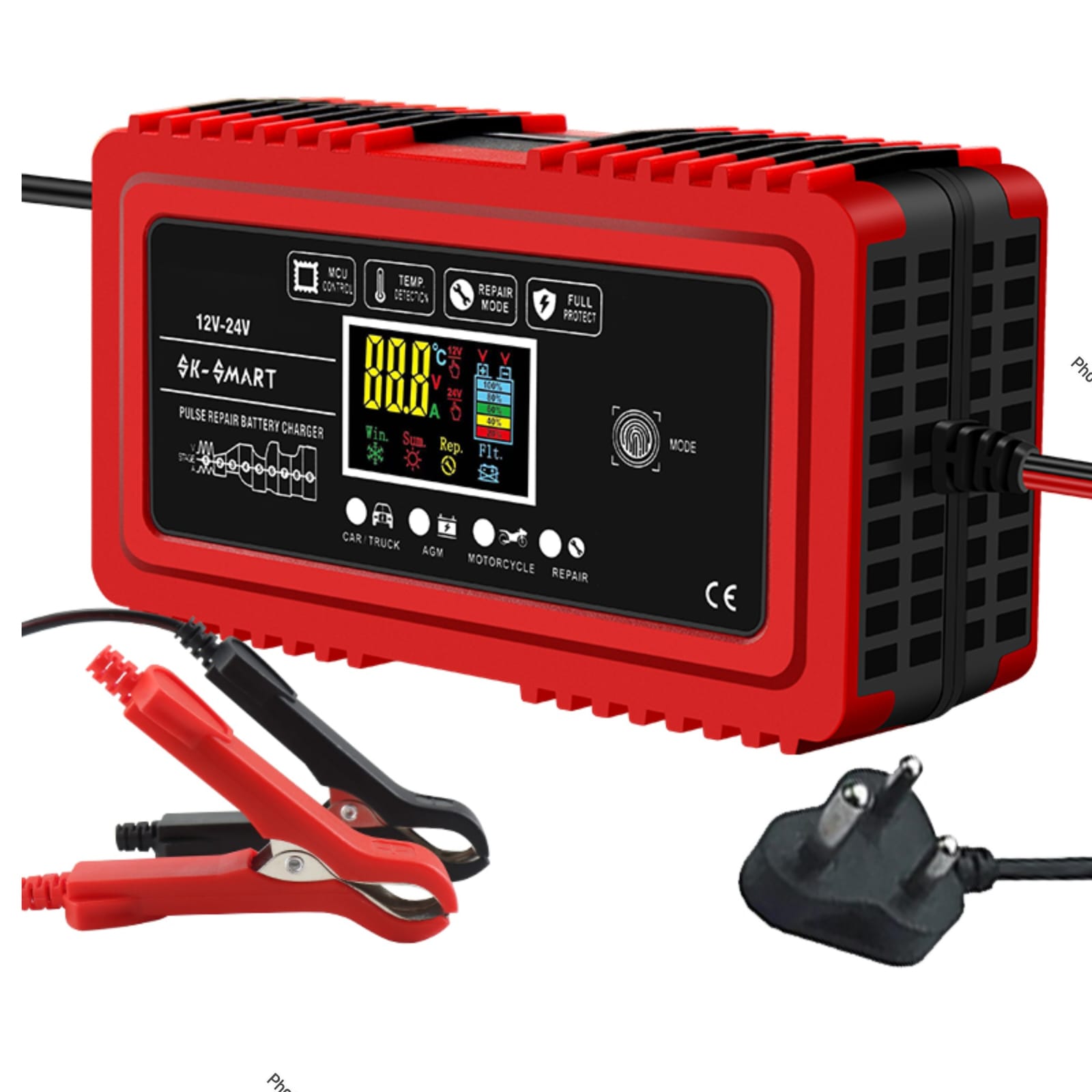 A powerful and intelligent battery charger designed for both 12V and 24V batteries. Built with advanced pulse repair technology, it helps revive weak batteries while ensuring fast, safe, and efficient charging. The bright digital display provides real-time monitoring of voltage, current, and charging status. Ideal for cars, trucks, and motorcycles, this charger is perfect for both home and professional use.
