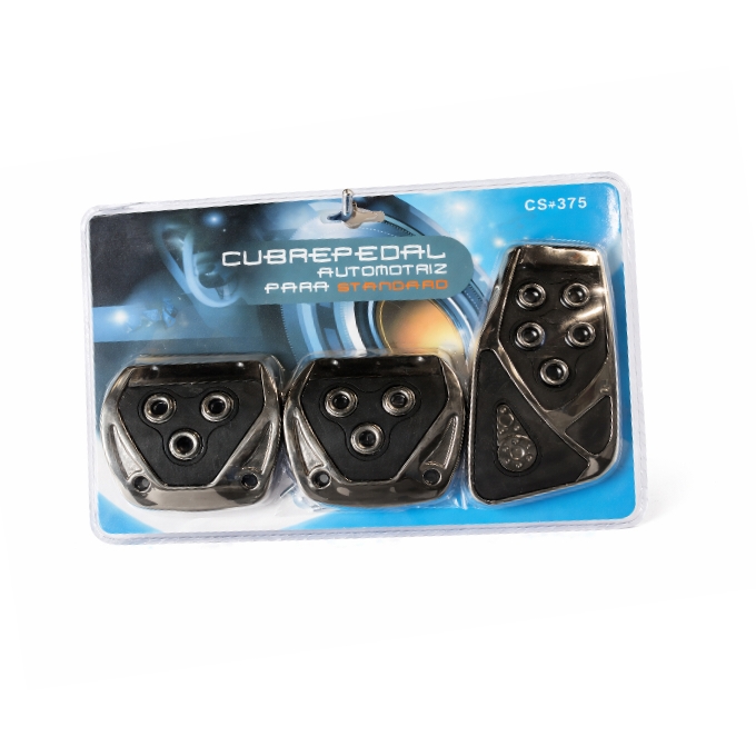 This is a set of automotive pedal covers designed for standard manual transmission vehicles. The set includes three pedal covers: accelerator, brake, and clutch. Each cover is crafted with a combination of durable metal and non-slip rubber inserts, providing both enhanced grip and a sporty look for your vehicle’s interior. The covers are easy to install over existing pedals, giving your car a stylish upgrade while improving driving comfort and safety. The packaging displays a clear view of the pedals and includes a modern, eye-catching design.