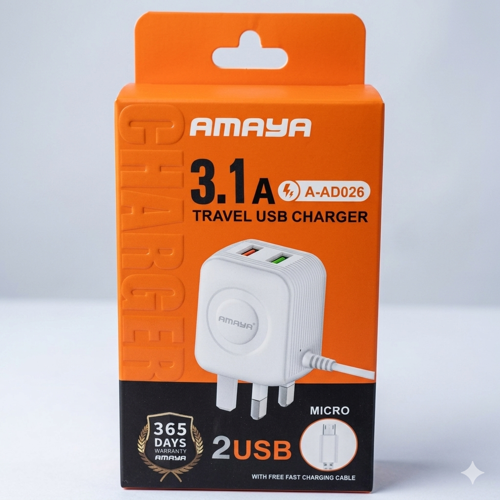 Amaya A-AD026 Dual USB Fast Charger: 3.1A High-Speed Power Hub with Micro-USB Cable