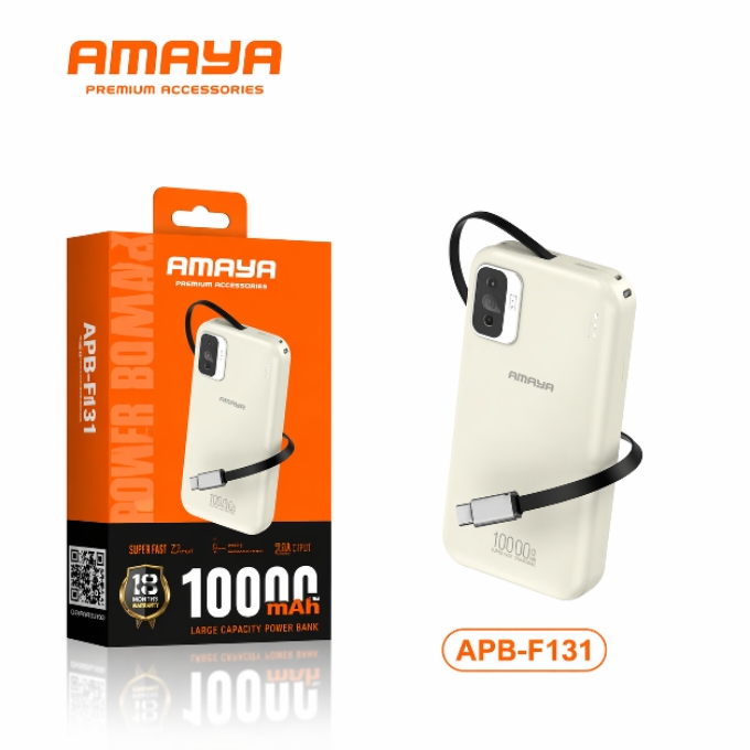 The AMAYA Power Bank APB-F131 combines sleek design and powerful performance to keep your devices charged whenever you need them most. With a robust 10,000mAh capacity, this power bank offers substantial power storage, ensuring your devices stay charged on the go. Featuring 22.5W Super Fast Charging technology, the APB-F131 ensures a quick and efficient power boost for your smartphones, tablets, and other USB-powered devices. Whether you’re at home, at work, or traveling, this power bank is the perfect companion for your charging needs.