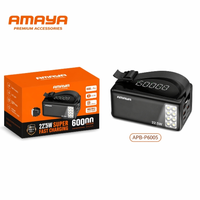 The AMAYA APB‑F600L is a high‑capacity, versatile portable power bank designed for modern devices. With an impressive 60000 mAh battery, it delivers long‑lasting power on the go — perfect for camping, traveling, work, emergency backup, and everyday use.