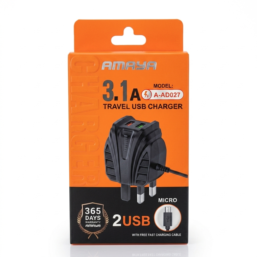 The AMAYA A-AD027 is a high-performance Travel USB Charger designed to provide a fast and stable power supply for your mobile devices. Encased in a rugged, textured black housing, the charger is built for durability while maintaining a compact form factor ideal for commuters and travelers.