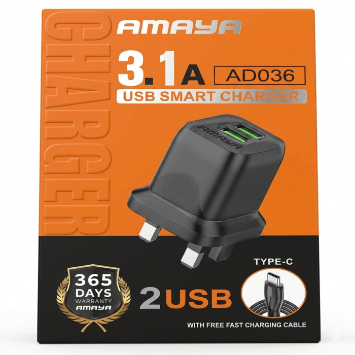 Amaya AD036 3.1A Dual USB Smart Charger with Type-C Cable