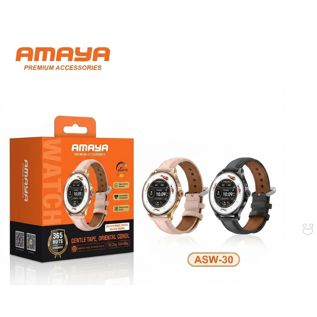 Amaya Lumea ASW-30, a versatile AMOLED smartwatch designed to blend everyday style with robust health and fitness tracking. Known for its vibrant 1.32-inch high-resolution touchscreen, the watch offers a premium viewing experience with deep contrast and sharp clarity.Â