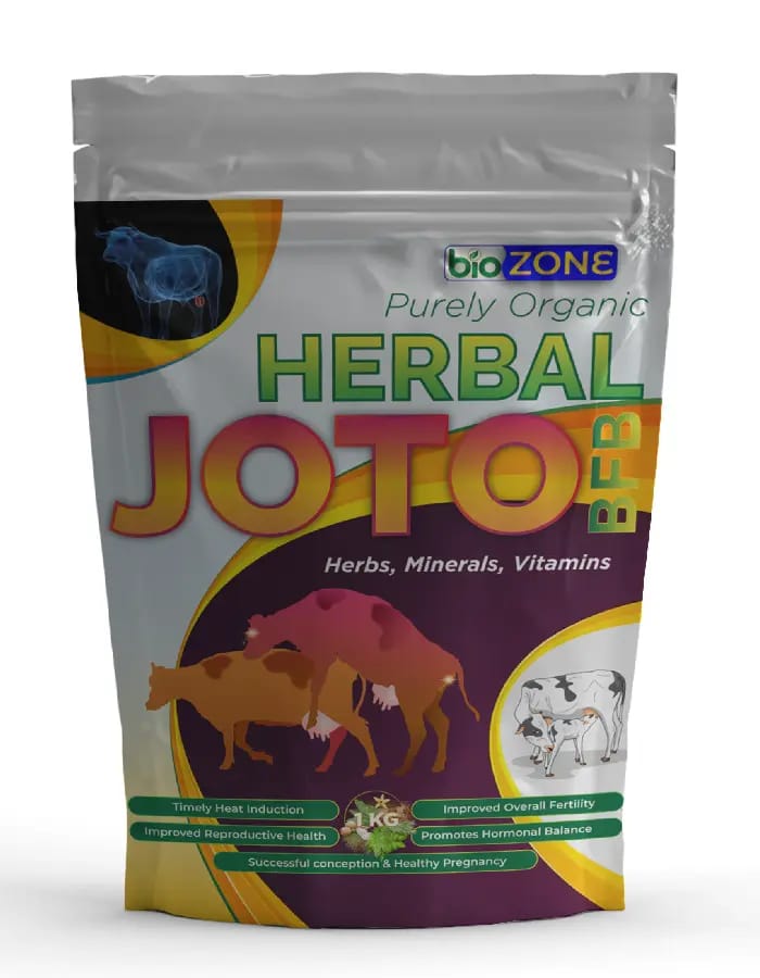 Biozone Herbal JOTO BFB is a premium organic livestock supplement formulated with a balanced blend of herbs, minerals, and vitamins to support reproductive health in cattle. It is specially designed to regulate oestrous cycles, promote hormonal balance, and improve overall fertility in cows and buffaloes.