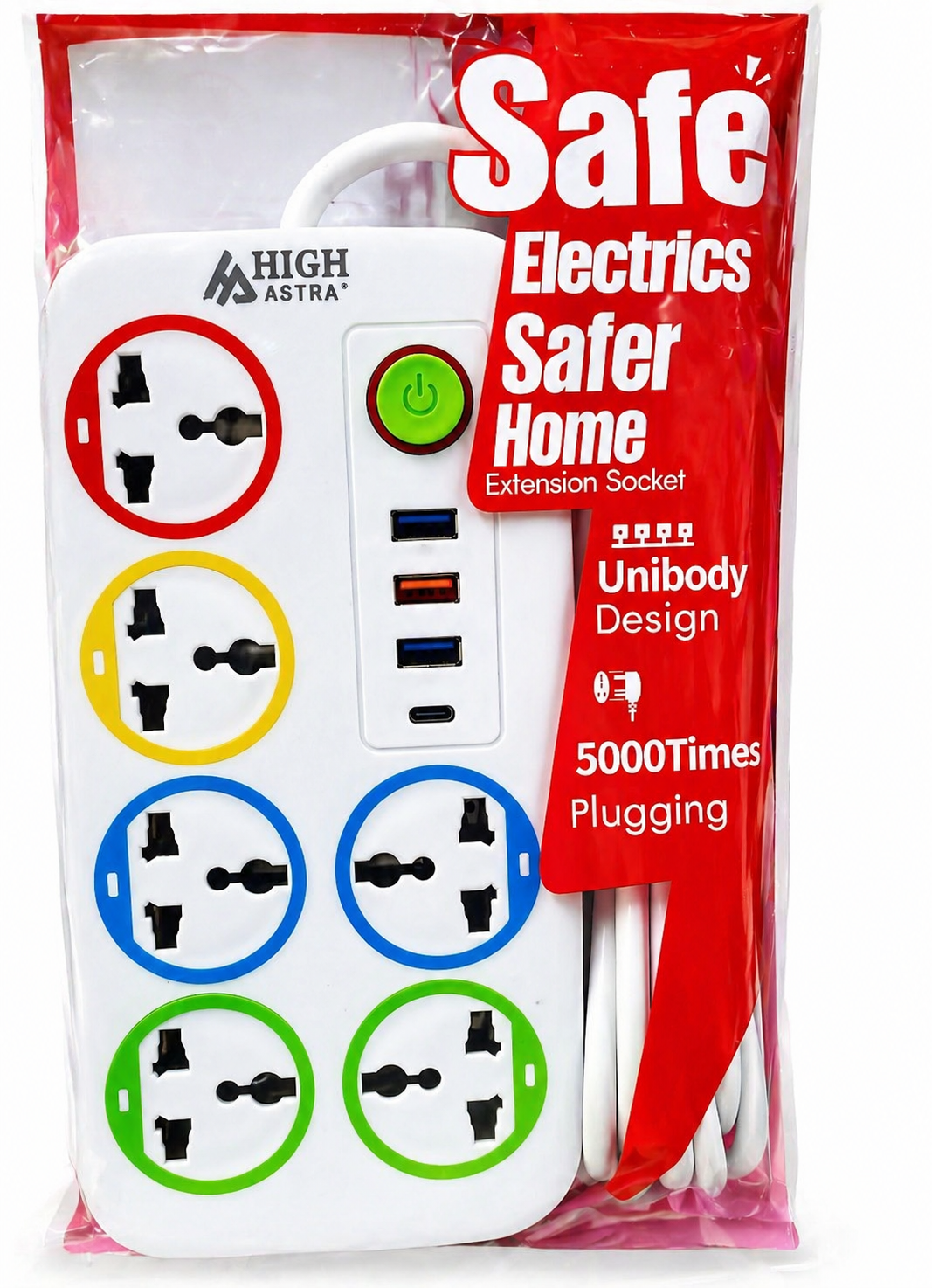 The HIGH ASTRA Safe Home Extension Socket is designed to offer a combination of safety, functionality, and durability. This extension socket ensures that you can power your devices conveniently and securely, featuring a modern unibody design and multiple safety features. With color-coded outlets, USB charging ports, and a robust structure built for 5000 plug-in cycles, this extension socket is perfect for both home and office use.