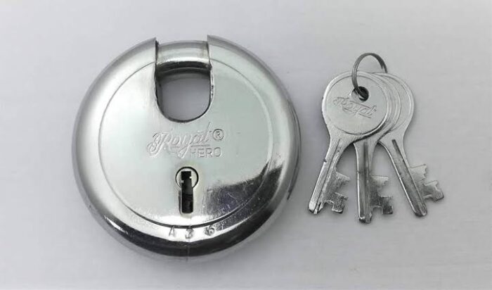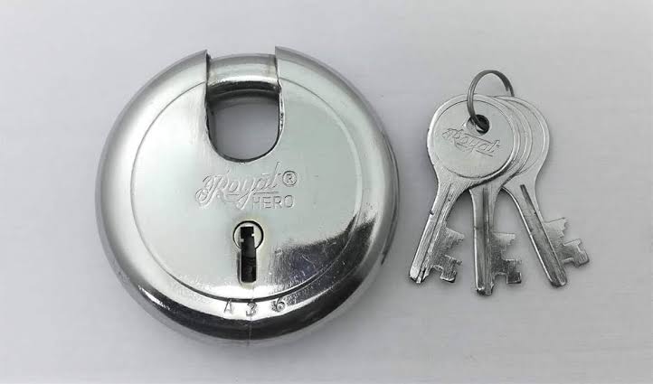 This sturdy, polished stainless steel padlock features a sleek round design, perfect for securing gates, lockers, or storage units. The lock has a U-shaped shackle opening for easy attachment and a reliable key mechanism. The “Royal® HERO” branding adds a touch of quality, while the three matching keys ensure backup access. Ideal for both personal and commercial use, this durable lock provides secure and hassle-free protection.