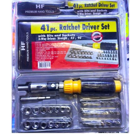 The 40 pcs toolkit includes reversible ratchet handle, metric sockets, Dr. SAE Socket, adaptor, ext. bar, Spark Plug Socket, Spinner Handle and Blow Case
